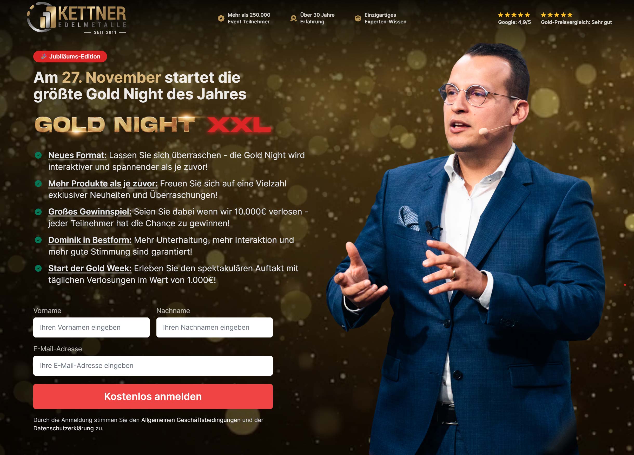 Die Gold Night ist eine monatliche Veranstaltung, in der 2-3 Speaker sprechen und Dominik Kettner persรถnlich die beliebtesten Produkte unserer Kunden prรคsentiert. Es gibt wertvolle Informationen fรผr Anleger & tolle Edelmetalle zu sehen in der Kettner GOLD NIGHT. Dies ist eine weitere monatliche Live Veranstaltung mit Hauptfokus auf den Verkauf von Edelmetallen.