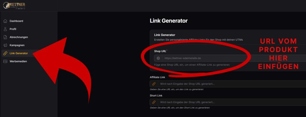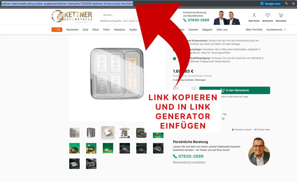 Kopiere wie im Bild dargestellt den Link zum Produkt und fรผge Ihn in den Link Generator ein im Backend:
